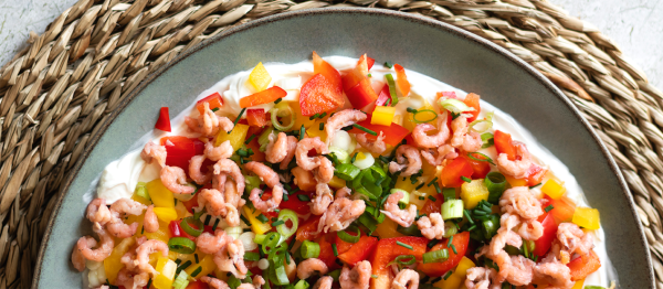 Snijd de rode en gele paprika in fijne blokjes. Snijd daarna de lente-ui in fijne ringetjes. Strijk met een lepel een kuipje witte roomkaas op een leuk bord. Doe hierover een dun laagje cocktailsaus. Verdeel hierop de paprikablokjes. Verdeel er daarna de lente-ui over. Knip er een handvol bieslook over. Verdeel er vervolgens de garnalen erover. Serveer met lekkere toastjes of chips naar keuze. Geniet!