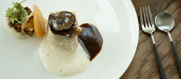 Stoof de cantharellen en 4 roosjes bloemkool aan in wat olie en kruid met peper en zout. Portioneer de rollade. Overgiet met een scheut olijfolie plaats gedurende 5 min in de oven op 180 °C. Begin met een streepje bloemkoolcrème op het bord. Plaats de gebakken cantharellen en bloemkoolroosjes op de crème. Leg daarna de rollade op het bord en werk af met enkele schijfjes zwarte truffel. Werk af met de kippenhuid, een takje cervel, de opgeschuimde OG kristal en de donkere kippenjus.