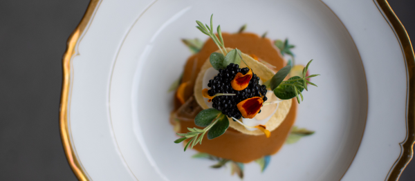 Leg een dotje knolselderpuree in het midden van het bord. Leg daar de blini op. Doe daarna de patrijs op de blini en giet er de saus over. Werk dit af met een krokantje, een kwartelei en de haringkaviaar. Voeg naar keuze kruiden en bloemen uit het seizoen toe.