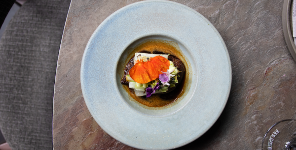 Neem een diep bord. Leg de varkenswang in het midden van het bord en doe er een lepel van de saus er over. Snijd de Chinese kool in stukken en leg ze bovenop de varkenswang. Spuit er daarna de wasabimayonaise over. Werk af met limoenzeste en furikake.