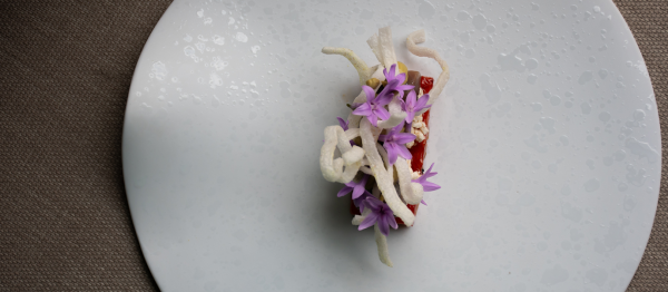 Marineer de watermeloen met de vinaigrette van dashi, grof zout en limoenzeste. Plaats de watermeloen daarna op een bord en bedek met de fetakaas en enkele stukjes maatjesharing. Verdeel er vervolgens enkele dotjes pistachecrème over. Werk af met de rijstnoedels die je mooi in de hoogte gaat verdelen.
