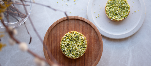 Vul de taartbodem met de crèmeux van yuzu en strijk de bovenkant mooi glad met een spatel. Dip je taartje tenslotte in de witte chocolade-pistachecrumble.